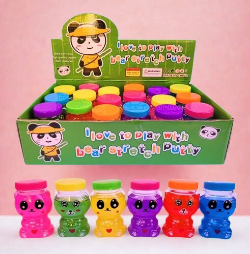 ¡Diversión garantizada con el Bear Stretch Putty! Este juego incluye varios frascos de masa elástica (putty) en forma de ositos de colores brillantes y llamativos.
